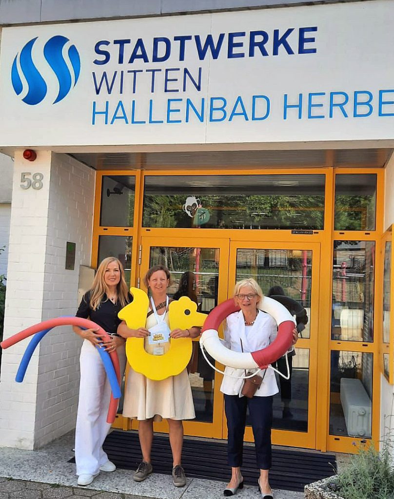 Schwimmen gehört zu den grundlegenden Fähigkeiten, die jedes Kind erlernen sollte. Umso schöner, wenn es mit viel Spaß in den Sommerferien geschehen kann. Im Rahmen der Wittener Ferienspiele finanzierte der Lions Club Rebecca Hanf Schwimmkurse für Kinder. Die Kurse wurden im Hallenbad Herbede durchgeführt. Alle teilnehmenden Kinder haben das Seepferdchen und einige sogar das Bronze- und Silberabzeichen geschafft. Andrea Hold vom Amt für Jugend und Schule der Stadt Witten und Organisatorin der Wittener Ferienspiele (Foto Mitte) bedankte sich herzlich bei der Präsidentin des Lions Clubs Rebecca Hanf Dr. Monika Klass (rechts) und Barbara Dieckheuer (links) für die Finanzierung der Kurse. Die Kurse waren ein voller Erfolg für Kinder und Organisatoren!